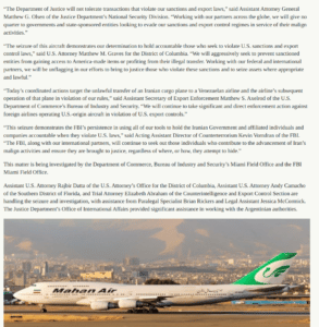 According to a statement published on its website, the court of the District of Columbia issued a seizure order on July 19, in which it is “alleged that the aircraft manufactured in the United States is subject to forfeiture due to violations of US export control laws related to the unauthorized transfer of the plane from Mahan Air, an Iranian airline affiliated with the Revolutionary Guard Corps-Quds Force (IRGC-QF).” Because Orinoco Tribune staff was unable to find an active link to the statement, it leaves the impression that the document was taken down.