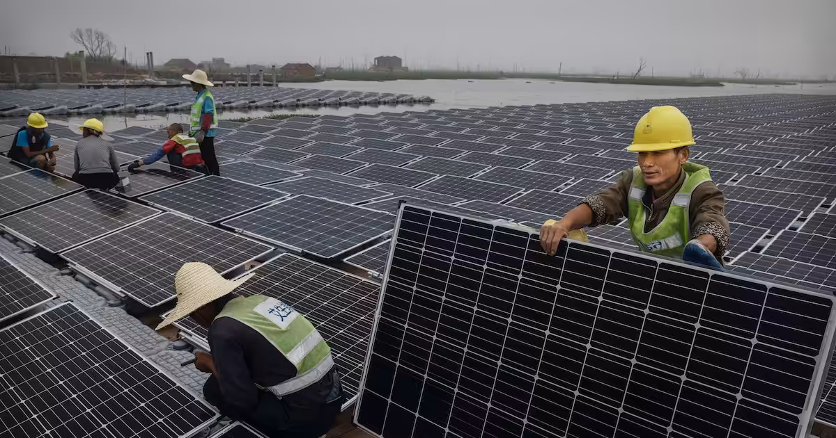 Chinese workers prepare panels that will be part of a large floating solar farm project under construction by the Sungrow Power Supply Company on a lake caused by a collapsed and flooded coal mine on June 13, 2017 in Huainan, Anhui province, China. Photo: Kevin Frayer/Getty Images.