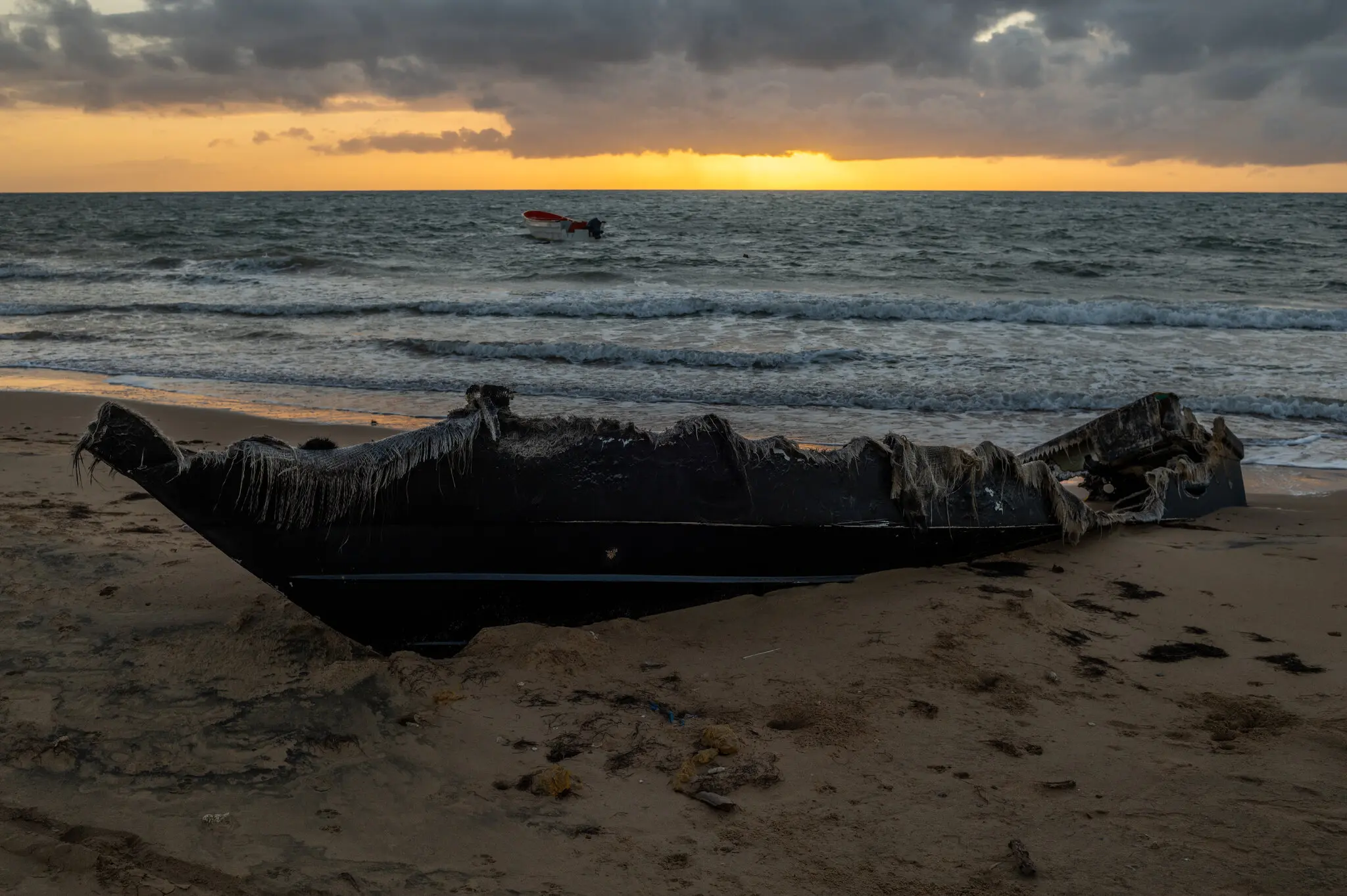 Remains of a burned boat on the beach, near Puerto López on the Guajira Peninsula in Colombia. Photo: Federico Rios/New York Times.