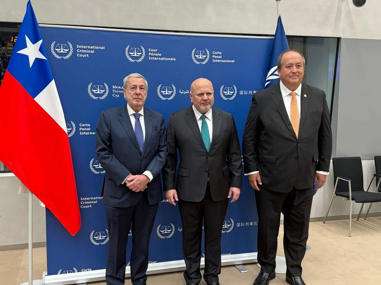 Chilean Foreign Minister Alberto van Klaveren (left) and Attorney Ángel Valencia (right) with ICC Prosecutor Karim Khan (center) at the ICC headquarters in The Hague, Netherlands, March 28, 2025. Photo: La Tercera.