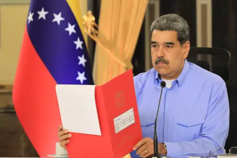 Venezuelan President Nicolás Maduro holding the draft of a decree regarding external unrest; the decree will protect Venezuela from US military aggression scenario. Miraflores Palace, Caracas, September 23, 2025. Photo: Venezuela's Presidential Press.
