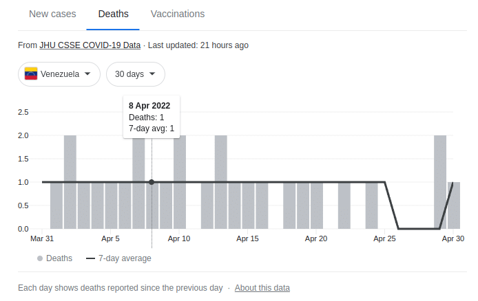 In the image below, taken from Venezuela’s official Patria COVID-19 website, one can see the dramatic decrease in COVID-19-related deaths in recent weeks in comparison to the peak reported on April 23, 2021, when 22 people died during the worst wave of the pandemic in Venezuela.
