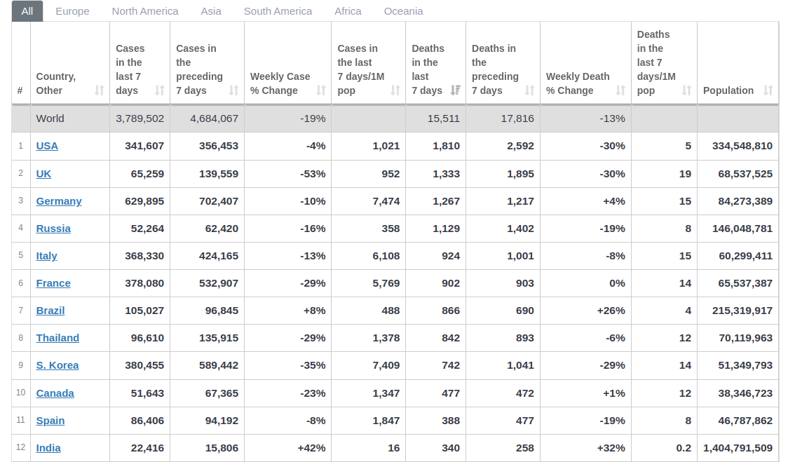 During the last week alone, according to Worldometers.info, 1,810 COVID-19 related deaths were reported in the United States, 1,333 in the UK, 1,267 in Germany, 1,129 in Russia, 924 in Italy, 902 in France and 866 in Brazil. Germany and Brazil reported more deaths than the previous week.