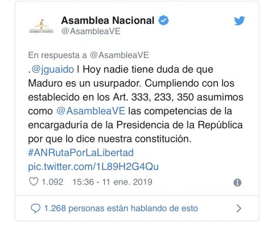 Mixing articles of the constitutional text in a disjointed form, such as 233 and 350, and being outside the National Assembly, he tried to calm the pressures symbolically assuming the powers of the executive on the way to a “transitional government” leading to new elections, but at the same time requesting the support of the Bolivarian National Armed Force (FANB), together with international pressure and street mobilization, to “make it happen”. Following El Estímulo, Juan Guaidó is and is not president at the same time.