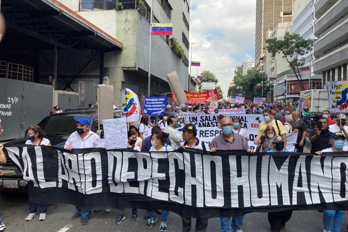 Workers and pensioners protesting in front of Venezuelan Central Bank, Urdaneta Avenue, Caracas. Many of these protests are orgnaized by opposition parties and the Venezuelan Communist Party. Photo: Twitter/@promedehum.