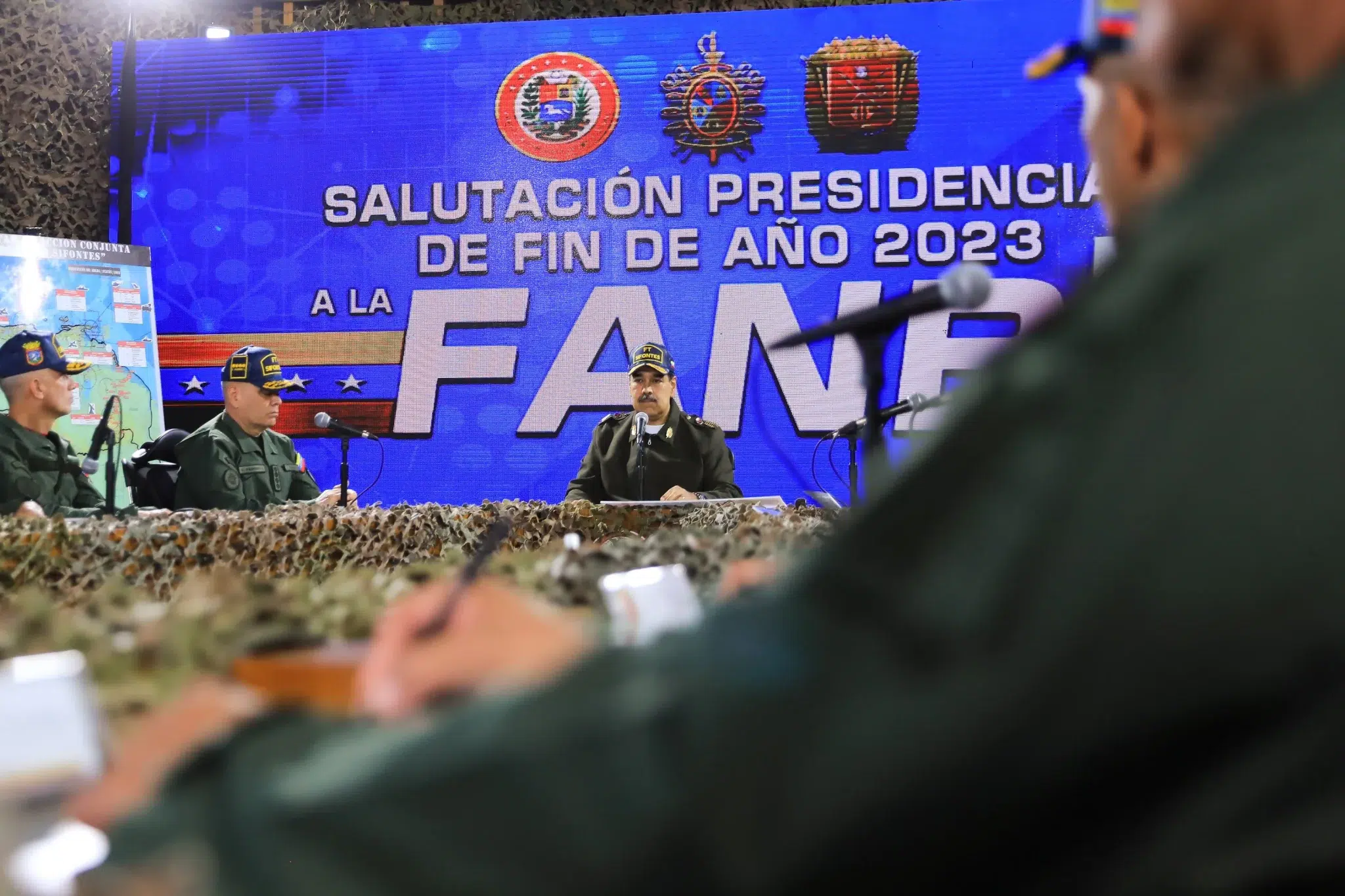 The president of Venezuela, Nicolás Maduro, presenting his end-of-year salutation message to the Bolivarian National Armed Forces, announcing the deployment of a joint military operation to face Guyanese and UK provocation, on Thursday, December 28, 2023. Photo: Presidential Press.