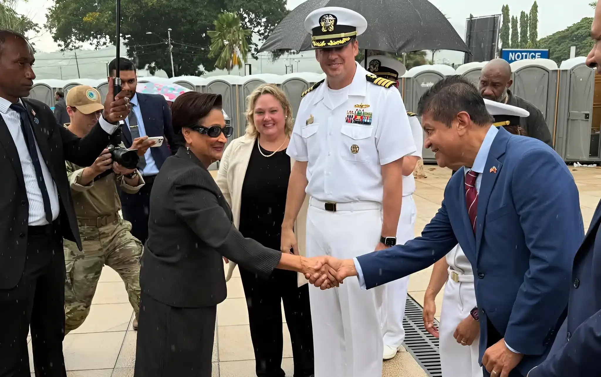 Kamla Persad-Bissessar, prime minister of Trinidad and Tobago, shaking hands with Lackram Bodoe, Minister of Health, while being greeted by US Navy officials during a visit to the hospital ship USNS Comfort, docked at the Port of Port-of-Spain on August 7, 2025. Photo: IG/@minhealthtt.