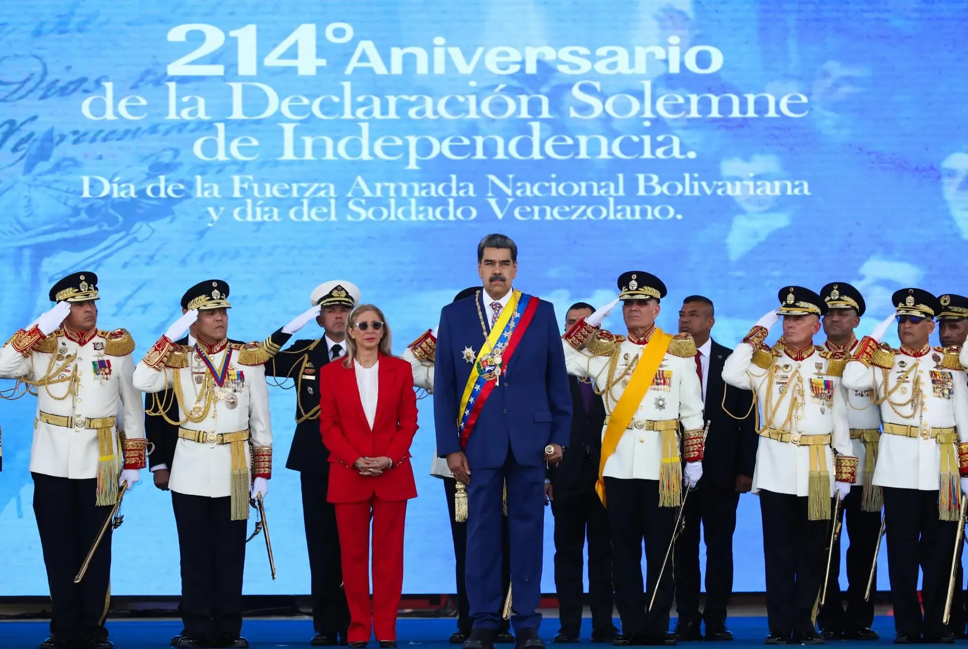Venezuelan President Nicolás Maduro accompanied by his wife, National Assembly Deputy Cilia Flores and by the Military High Commanders during the military parade celebrating the 214th anniversary of Venezuela's independence. Photo: Presidential Press.