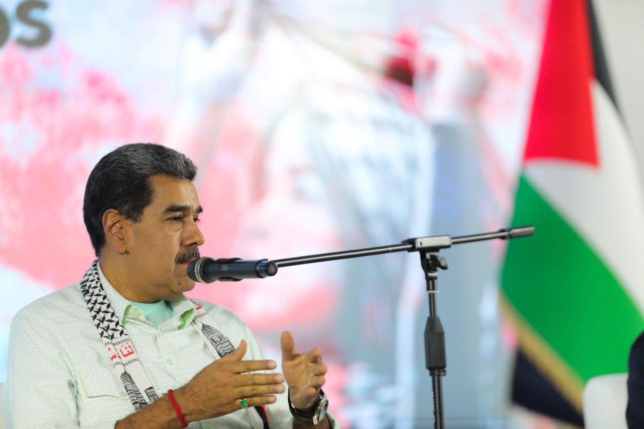 The president of Venezuela, Nicolás Maduro, speaks at the International Conference in Solidarity with Palestine, held in Caracas, Venezuela, on November 29, 2024.