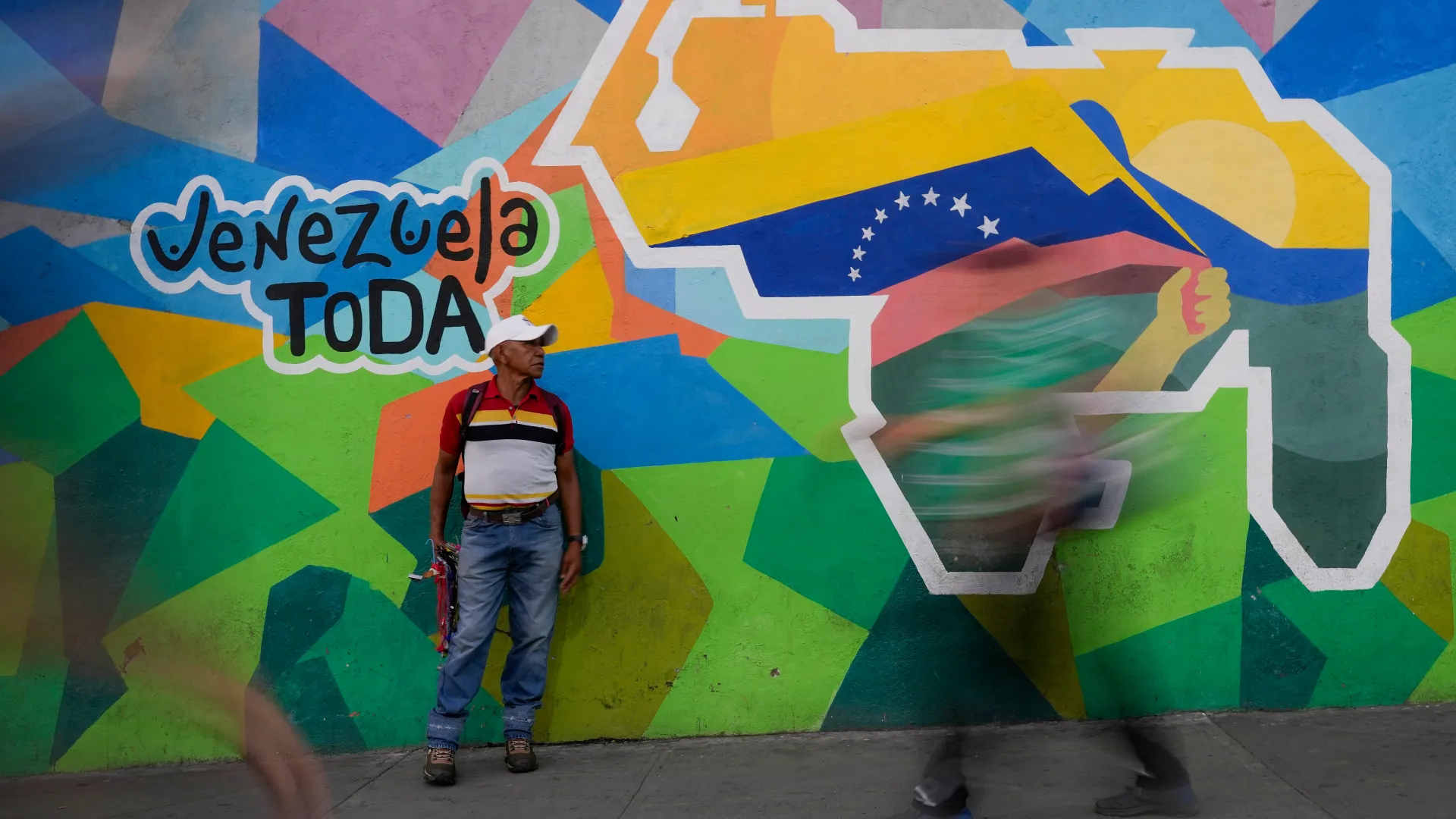 A man sells phone cables in front of a mural of the Venezuelan map with the Essequibo territory included in the Petare neighborhood of Caracas, Venezuela, in December 2023. Photo: Matias Delacroix/AP.