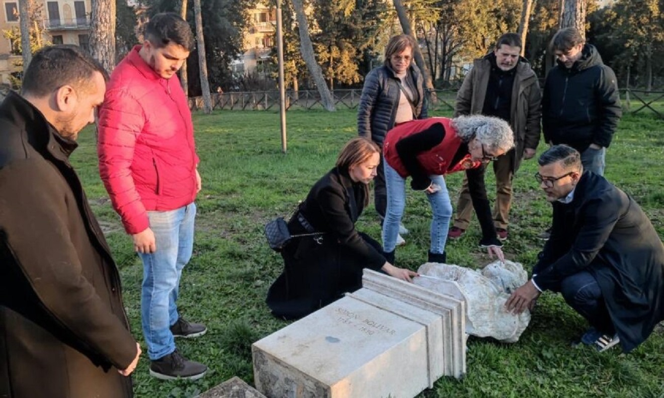 Municipal authorities of Rome take stock of the damage to a Simón Bolívar bust caused by unidentified vandals. Photo: Correo del Orinoco.