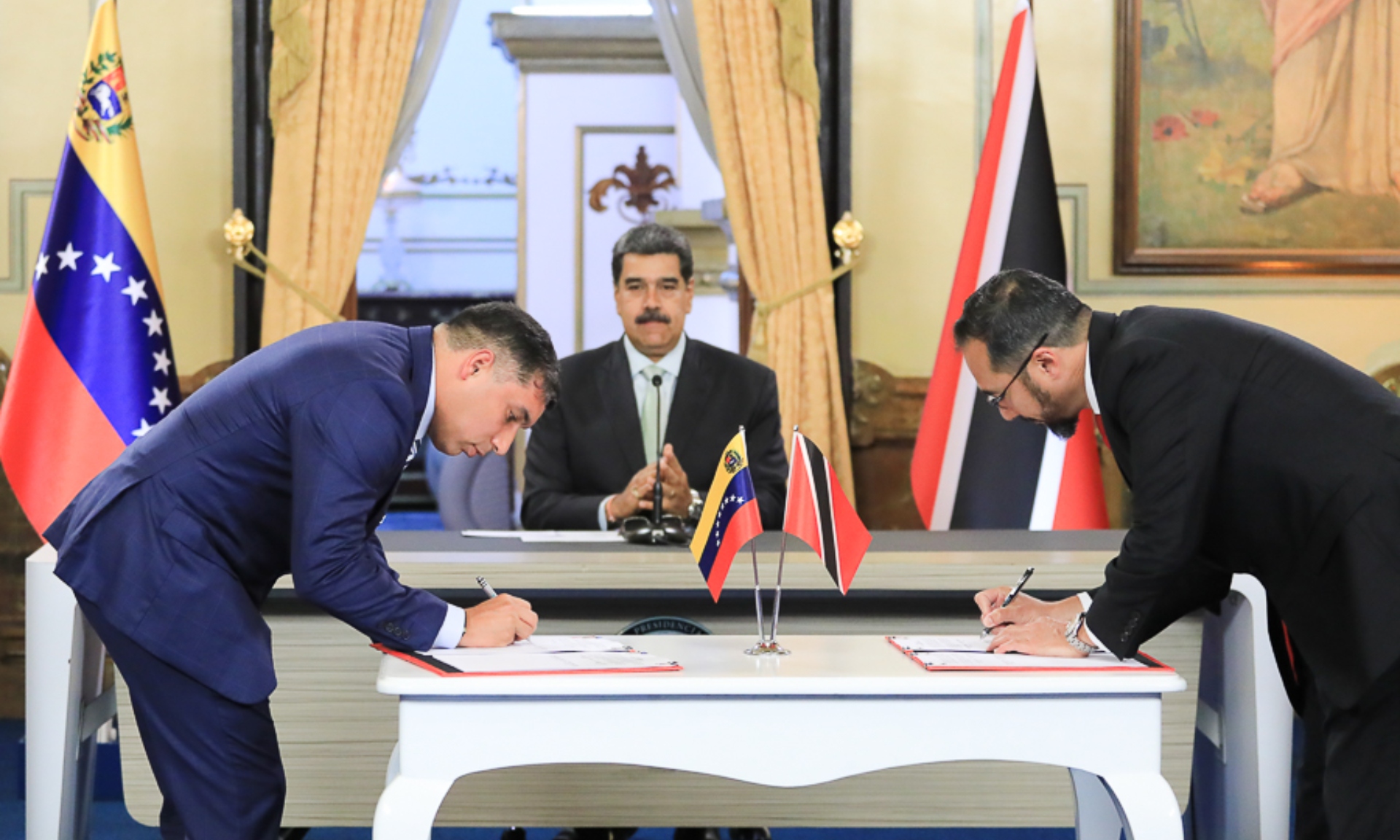 Venezuelan Oil Minister Pedro Tellechea (left) and Minister for Foreign Affairs Yván Gil (right) signing the gas production agreement with Trinidad and Tobago, with President Nicolás Maduro witnessing the ceremony (center, background) at Miraflores Palace, this Wednesday, September 20, 2023. Photo: Presidential Press.