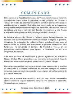 In an official statement dated December 15, 2025, in Caracas, the Venezuelan Executive reported that it has full knowledge of the participation of the Trinidadian government in this operation, described as an act of international piracy that constitutes a serious violation of international law, as well as of the principles of free navigation and free trade.