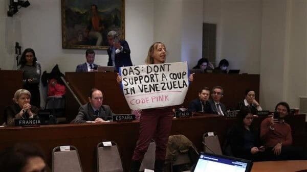 On January 25, the Organization of American States, which is traditionally a US tool, rejected a resolution to recognize Guaidó. Medea Benjamin of CODE PINK interrupted Pompeo at the OAS holding a sign that said: “a coup is not a democratic transition!” Venezuelan Foreign Minister Jorge Arreaza thanked Benjamin, saying, “With her protest, she revealed the macabre coup plan against Venezuela, we will always prevail, thank you!” Eighteen countries defeated the proposal.