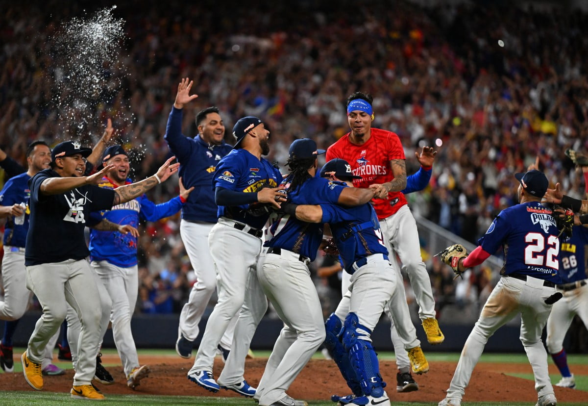 Venezuelan baseball team Tiburones de la Guaira celebrating after winning the Caribbean Series final in Miami, Florida, February 9, 2024. Photo: Chandan Khanna/AFP.