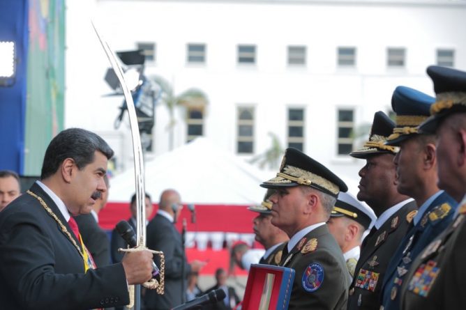 On the national Radio and Television broadcast, the Venezuelan Head of State received the sword replica from the military component, as a symbol of honor and loyalty. “I receive this sword as a great commitment to carry this sword with dignity and with it to end both interventionism and imperial threat, with the example of Bolivar, everything is possible,” said Maduro.