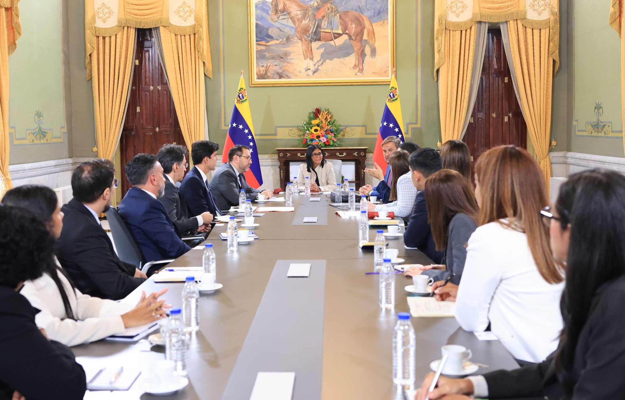 “This week, a delegation of diplomats will be leaving for Washington to begin this new stage of relations and political diplomatic dialogue between our government,” Acting President Rodríguez said during a meeting at Miraflores Palace with investors and business associations. “So welcome, thank you again, and I hope you return very soon so we can move forward with more concrete projects.”