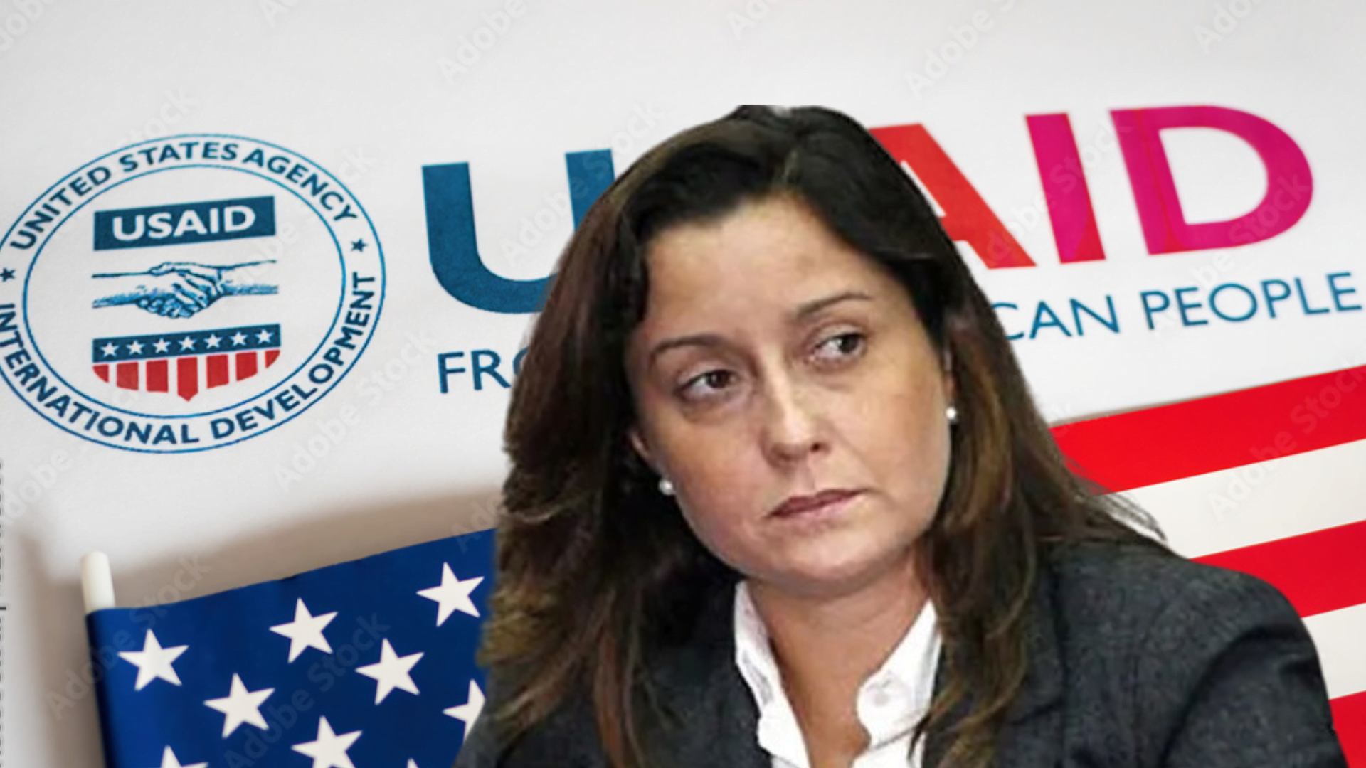 Photo composition showing US-supported NGO activist Rocío San Miguel with a background showing the USAID logo and the US flag. Photo: Orinoco Tribune.