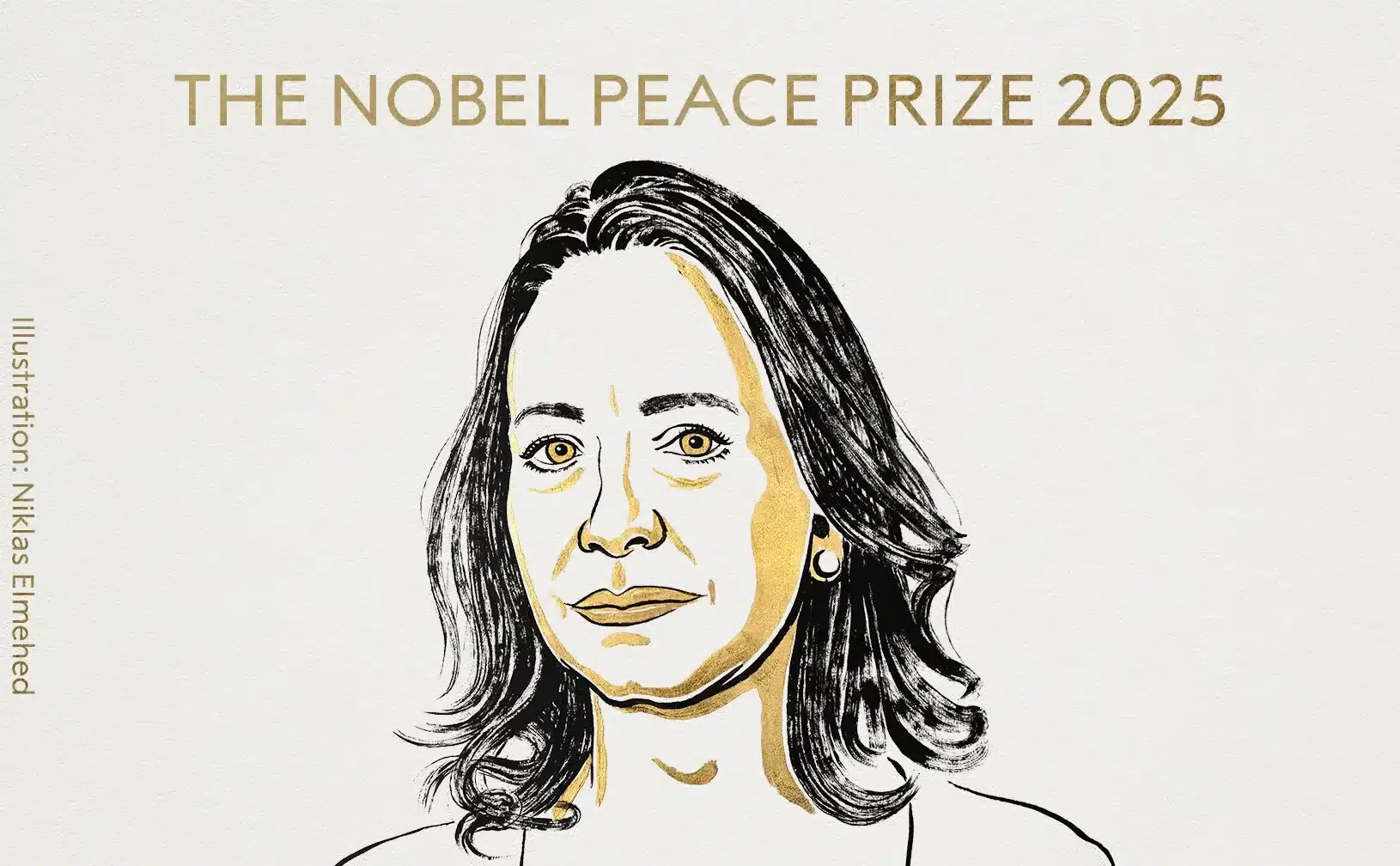 Nobel Peace Prize Committee poster portraying MarĂa Corina Machado as the 2025 award winner. Photo: Norway Peace Prize Committee.