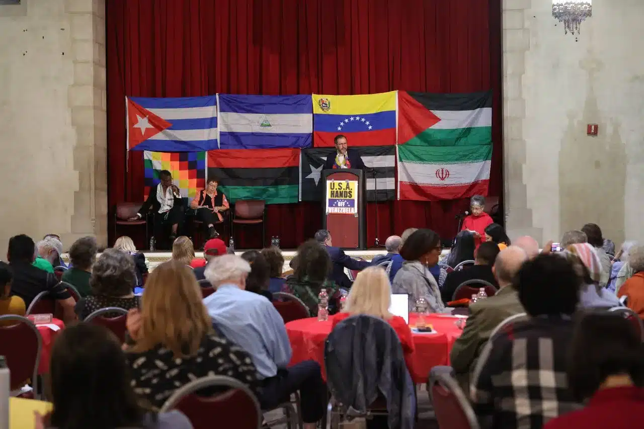 The event was organized by several US-based progressive organizations, including the Network for Action Against War, the Alberto Lovera Bolivarian Circle, Solidarity with Venezuela, the American-Palestinian Community Network, the National United Anti-War Coalition, Bronx Against War, the SanctionsKill Campaign, the December 12th Movement, Cuba Sí, the International Action Center, the Venceremos Brigade, the Freedom Road Socialist Organization, Americas Without Sanctions, the US Peace Council, and the Workers World Party. The gathering responded to growing US hostilities toward Venezuela, particularly amid the US naval deployment in Caribbean waters.