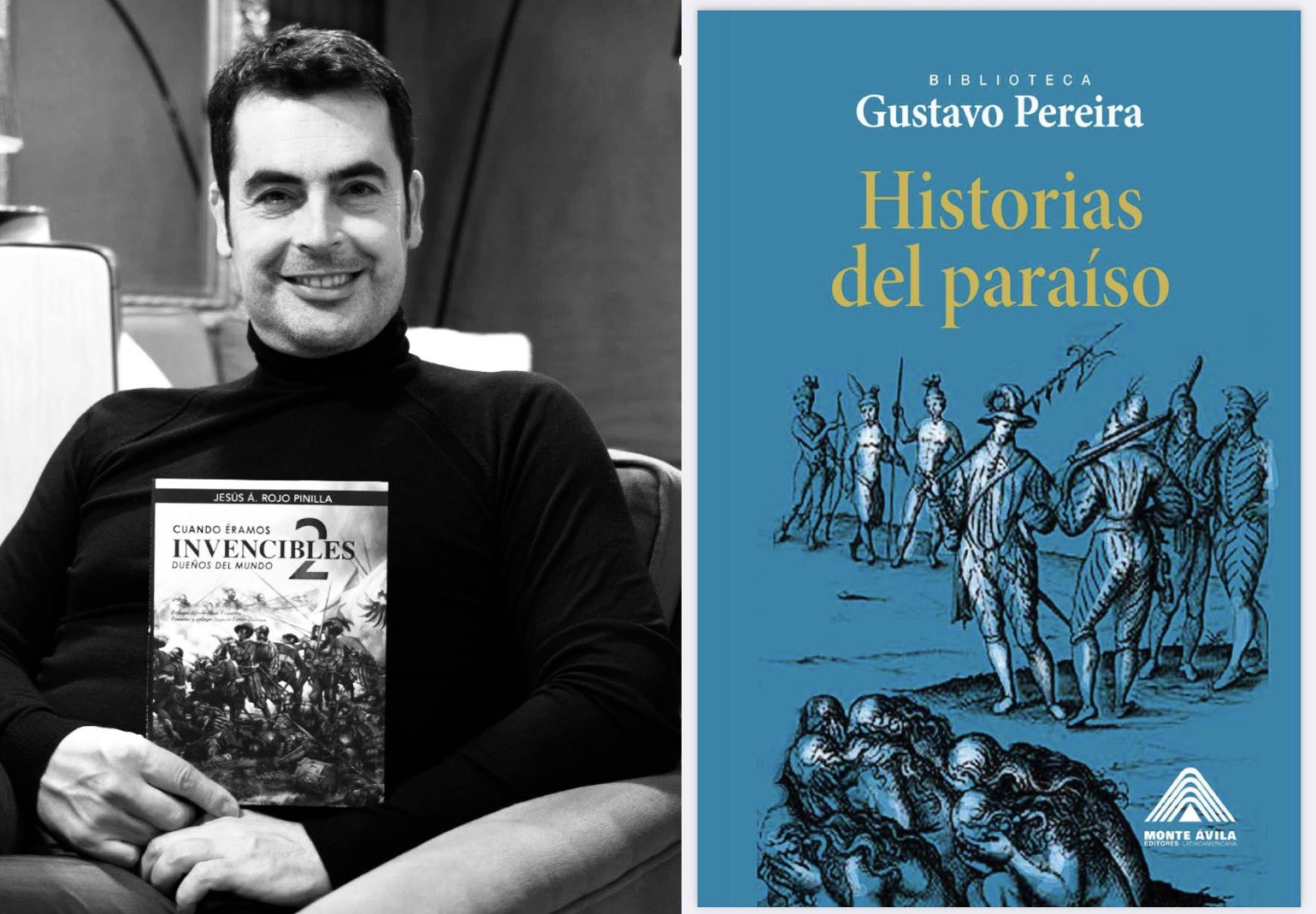 On the left, author Jesús Ángel Rojo poses with his book Cuando Éramos Invencibles, which attempts to justify the mass genocide and cultural destruction waged by the Spanish conquerors of the Americas. On the right is Historias del paraíso, which was recommended by Venezuelan Minister of Culture, Ernesto Villegas.