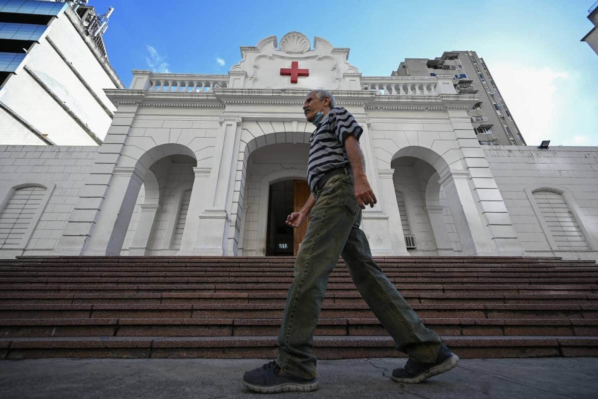 Man walking in front of the Venezuelan Red Cross headquarters in Caracas, on August 6, 2023. Photo: AFP.