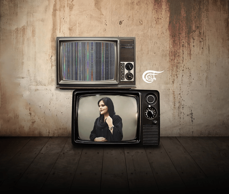Photo composition showing two TV screens, in which the image of Mahsa Amini and the other with no signal. Photo: Al Mayadeen.