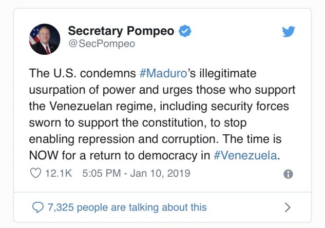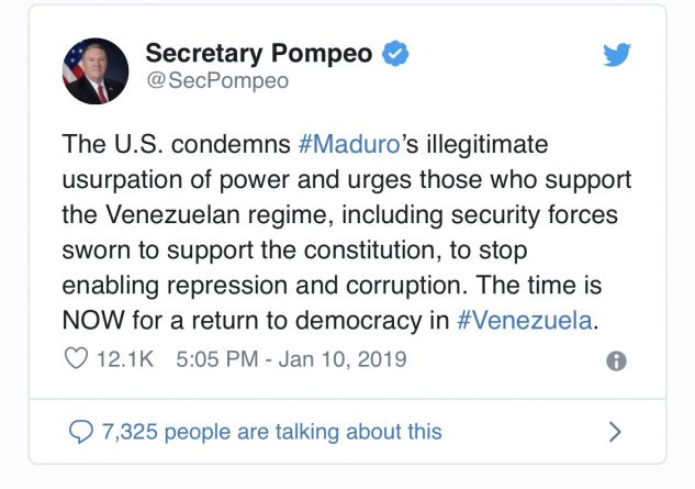 On 11 January, in a phone call to Guaidó, Pompeo reiterated his support for the National Assembly as the sole legitimate authority, although he avoided describing Guaidó as president (for now).