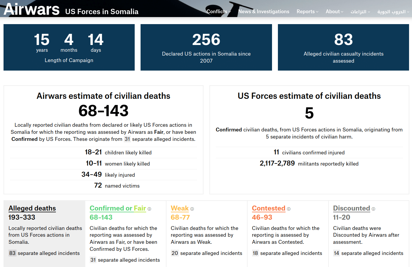 A UK-based NGO with funding from ultra-conservative George Soros’ Open Society Foundation, Airwars, reports that since 2002 between 68 and 143 civilian deaths have been reported as a result of direct actions of US forces in Somalia. Between 18-21 of them were children.