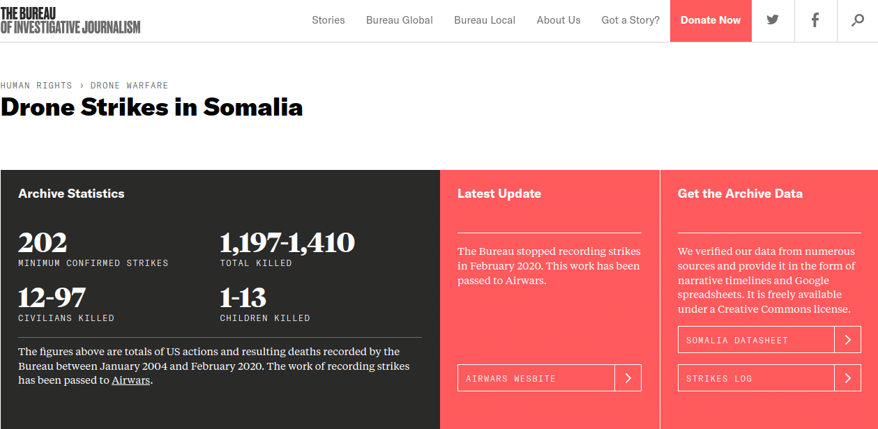 However, the Bureau of Investigative Journalism (also financed by mainstream corporate so-called philanthropic foundations) reported that, from 2004 until February 2020, at least 202 US drone strikes were confirmed, with a total death toll of between 1,197 and 1,410.