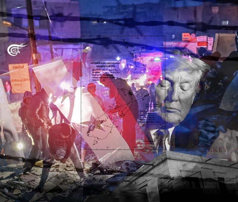 Collage of scenes of destruction in Syria following the 7.8 magnitude earthquake, with Trump's face superimposed, referring to the Western sanctions that are hindering the dispatch of aid to Syria. Photo composition: Al Mayadeen.