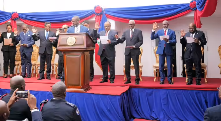 The infamous swearing-in on Apr. 25, 2024 of the nine members of Haiti’s Transitional Presidential Council, conceived by Washington, sold by CARICOM. Photo: Haïti Liberté.
