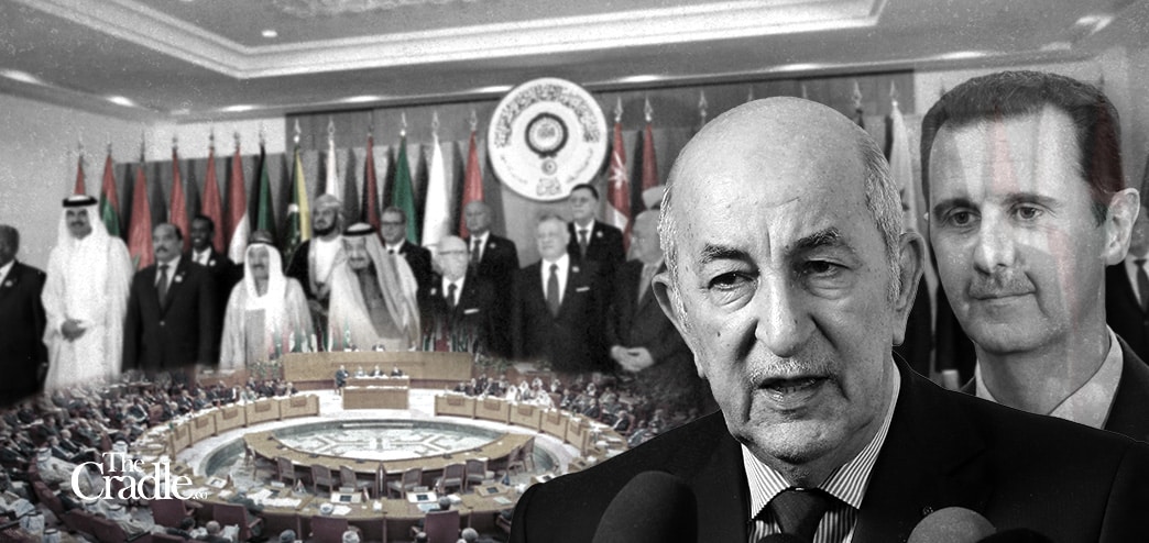 Photo composition with the images of Abdel Majid Tebboune and Syria’s Bashar Al Assad with a photo of an Arab League meeting in the background. Photo: The Cradle.