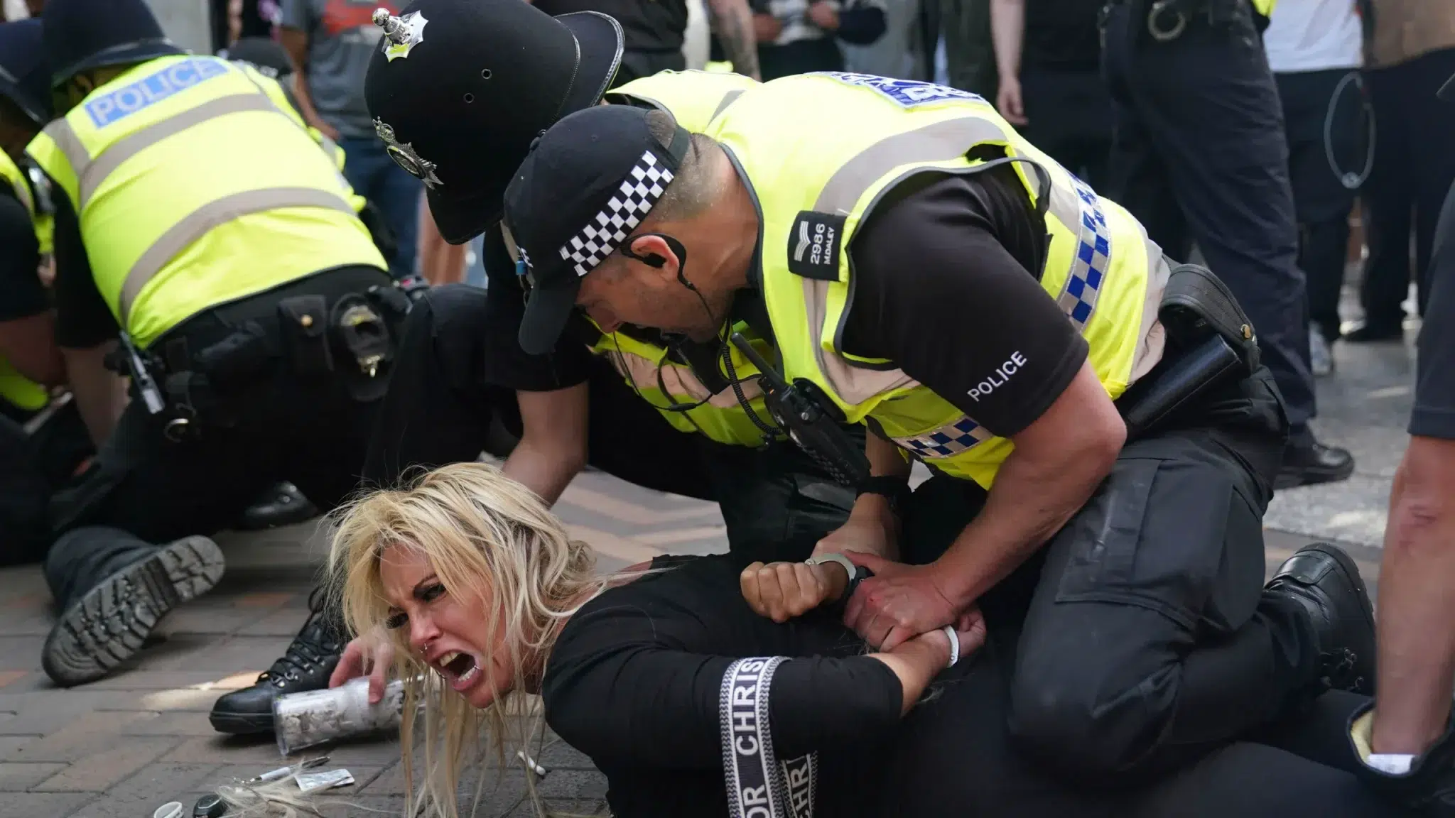 Police officer forcibly handcuffs a woman during a protest in Nottingham, England’s Market Square Saturday Aug. 3, 202. Photo: Jacob King/PA via AP.