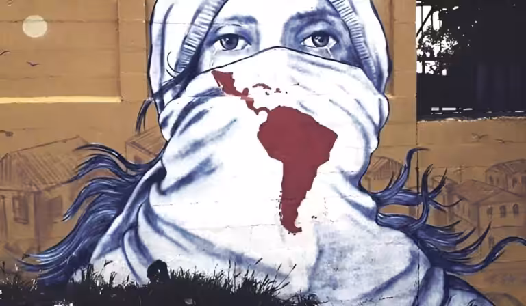 Street mural showing a face of a person crying with the face partially covered by a scarf with the map of Latin America and the Caribbean. Photo: Rebelion/file photo.