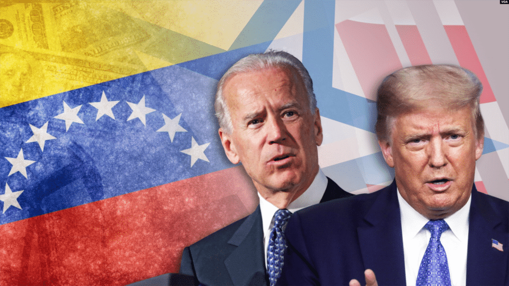 Photo composition portraying US President Donald Trump and former president Joe Biden with a Venezuelan flag in the background. Photo: VOA/file photo.