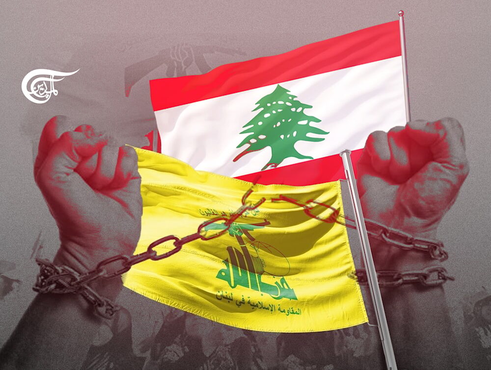 Photo composition displaying the chained fists of a person with the Lebanese and Hezbollah flags in the background. Photo: Hady Dbouq/Al Mayadeen.