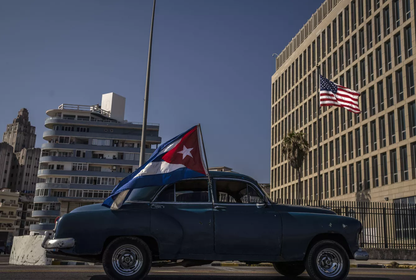 A classic American car flying a Cuban flag drives past the US embassy during a rally calling for the end of the US blockade against Cuba. Photo: AP/Ramon Espinosa.
