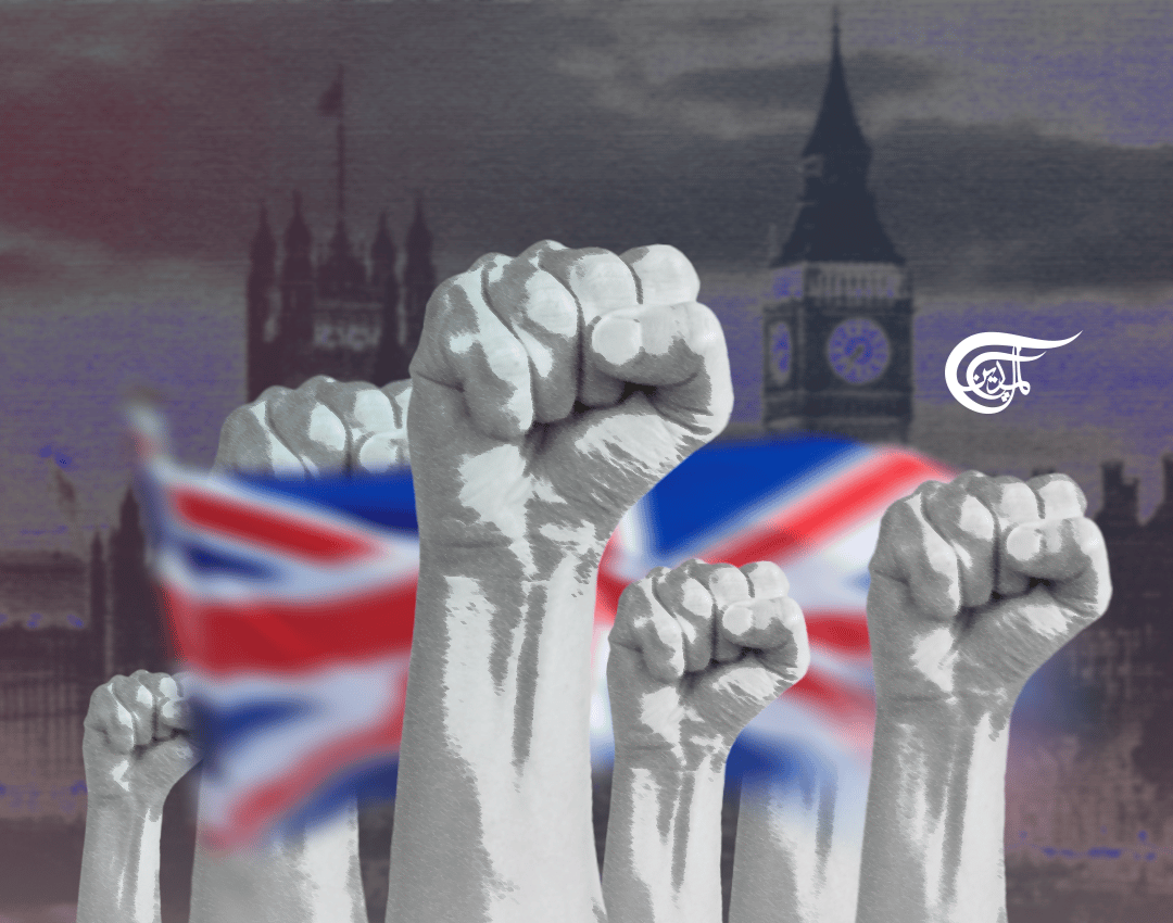 Photo composition showing several fist up, a UK flag and the UK parlament building in the background. Photo: Al Mayadeen.