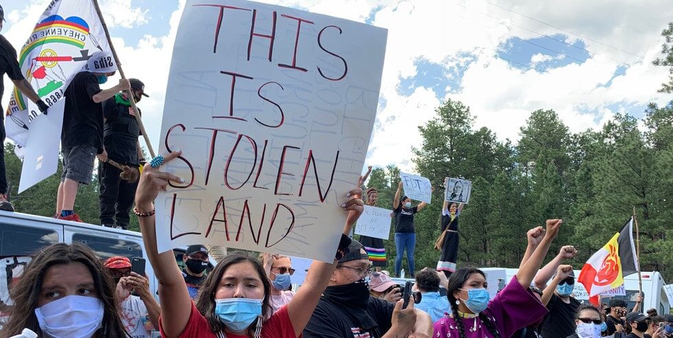 Native American protesters and supporters gather at the Black Hills, now the site of Mount Rushmore, on July 3, 2020 in Keystone, South Dakota. Photo: Getty Images / Micah Garen.