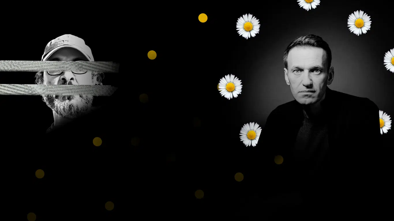 Illustration showing US journalist Gonzalo Lira (left) in darkness and his eyes and mouth covered by newspaper strips, and Russian opposition politician Alexei Navalny (right) in a spot of light and surrounded by flowers. Photo: MintPress News.