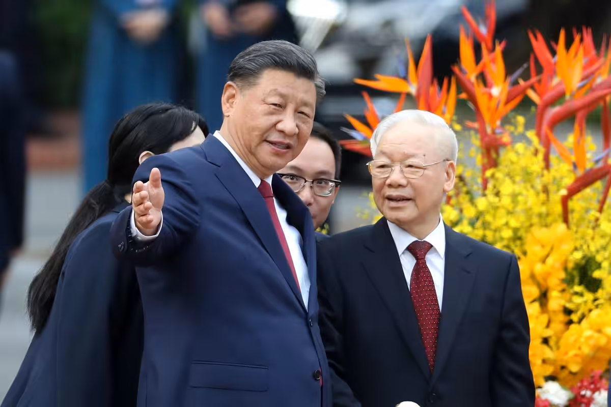 Xi Jinping, general secretary of the Communist Party of China Central Committee and Chinese president, attends a welcome ceremony held by Nguyen Phu Trong, general secretary of the Communist Party of Vietnam Central Committee, in front of the Presidential Palace in Hanoi, capital of Vietnam. Photo: Wang Zhuangfei/China Daily.