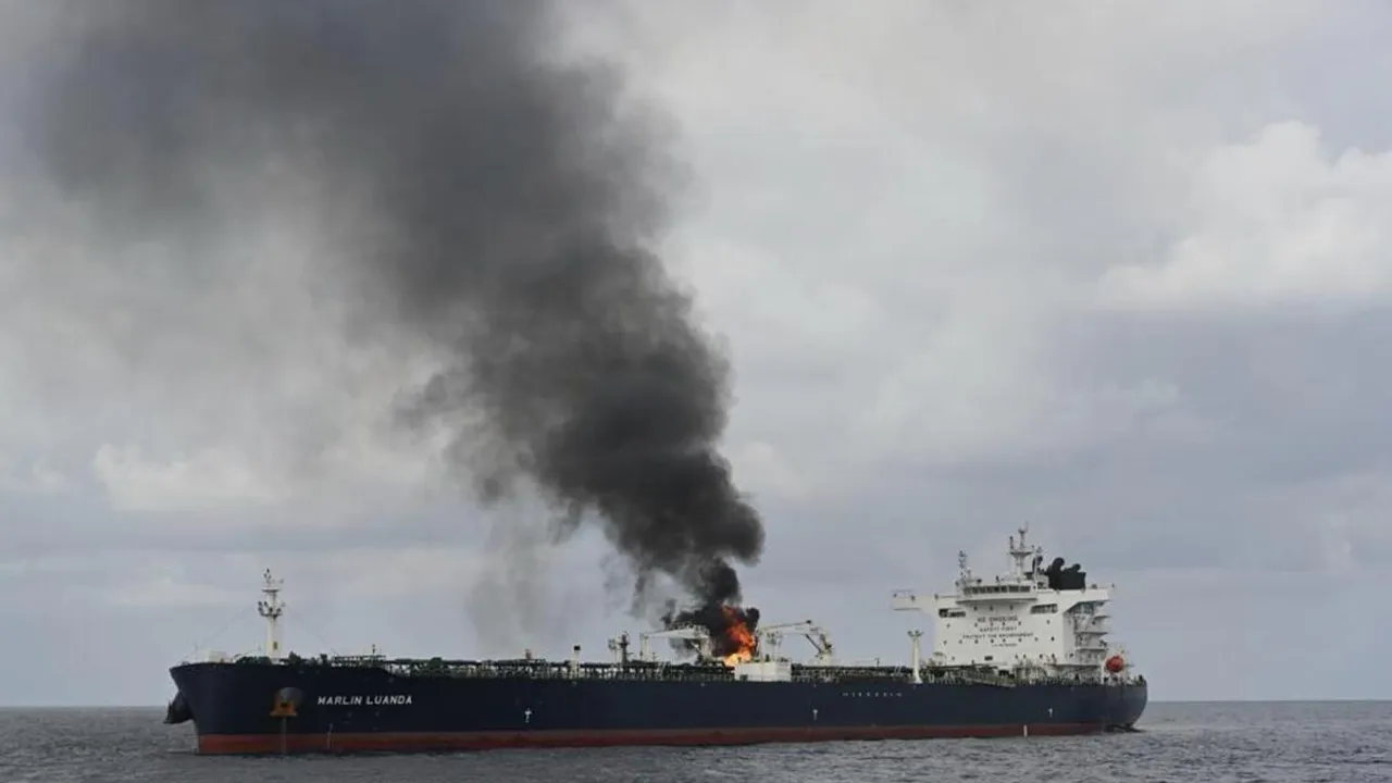 The British Marlin Luanda vessel in flames after a Yemeni attack in the Gulf of Aden in January. Photo: AP.