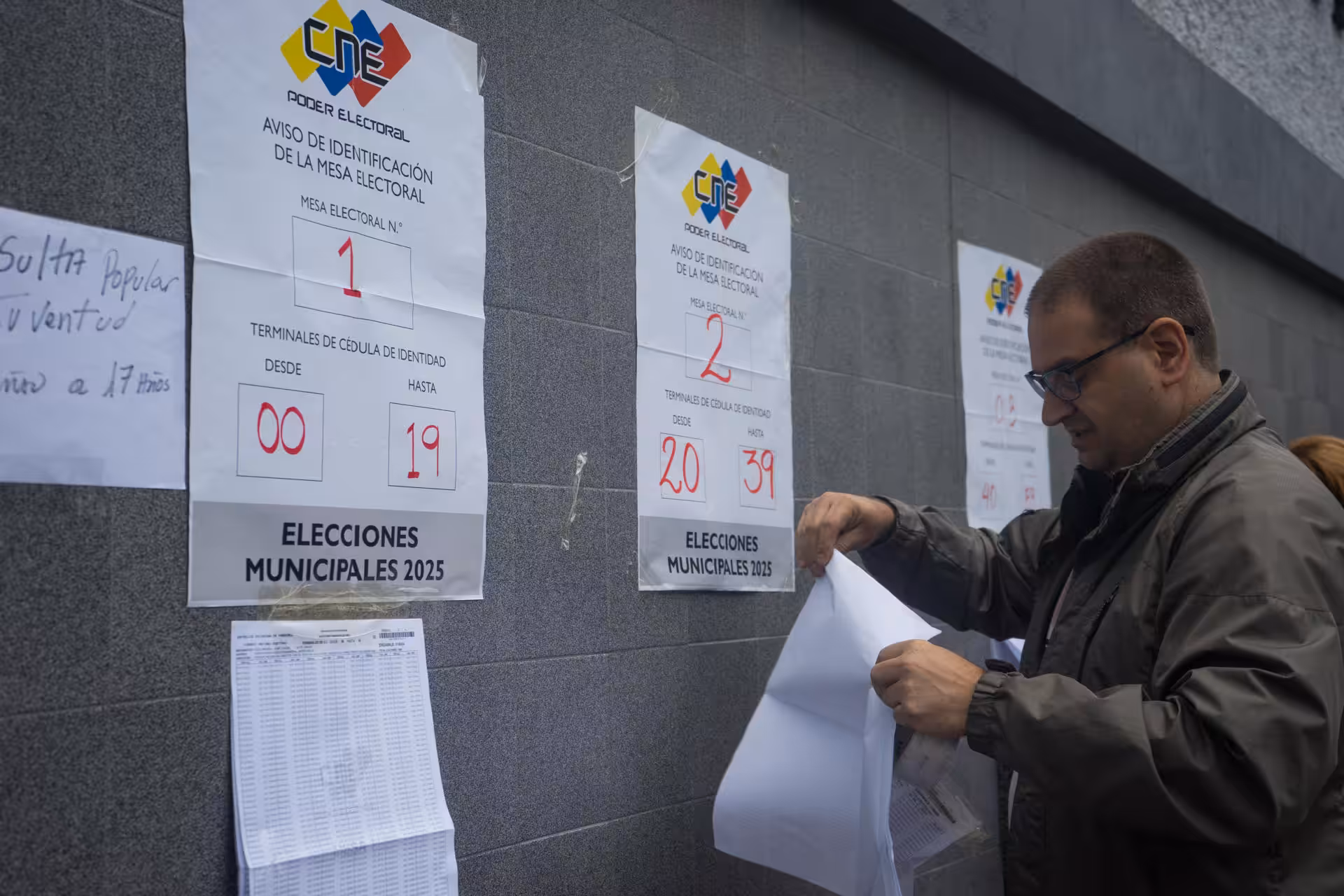 A man places the voting list at a polling station in Caracas this Sunday. Voting centers began opening their doors this Sunday in Venezuela. Photo: Boris Vergara/EFE.